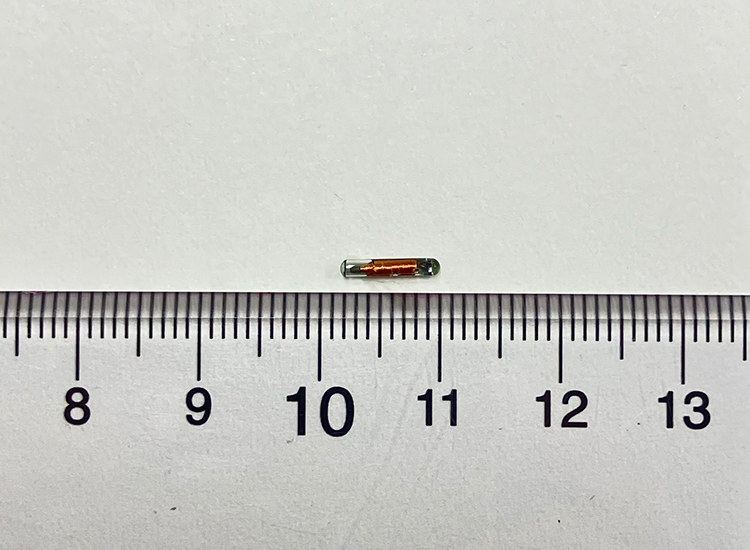 マイクロチップは、直径1.5mm、⾧さ8mmの円筒形のガラスのカプセルで包まれた電子標識器具で15桁の識別番号が記録されています。※GPS機能はありません。