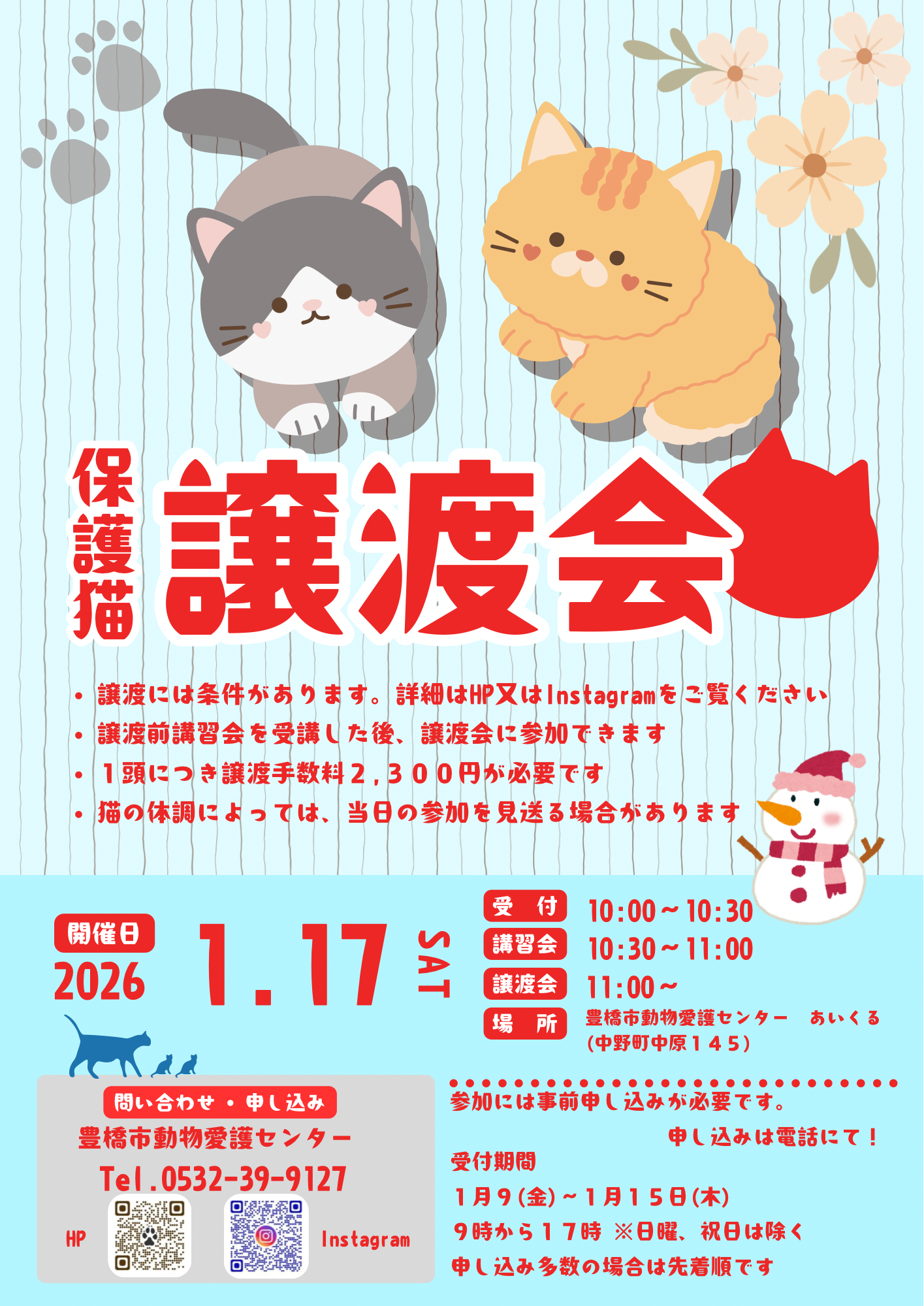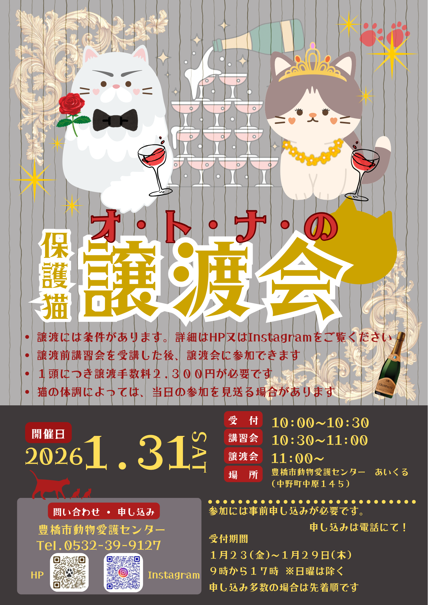 日時:令和8年1月17日(土曜日) 10時00分~10時30分 受付(身分証等確認) 10時30分~11時00分 譲渡前講習会 ※終了後、譲渡希望調査届を記入した方から受講証を交付・順次案内します。 1 […]