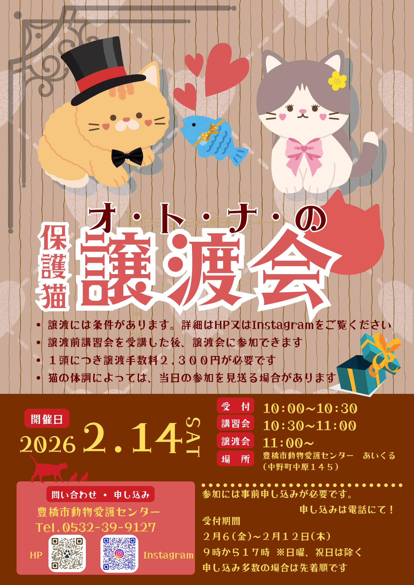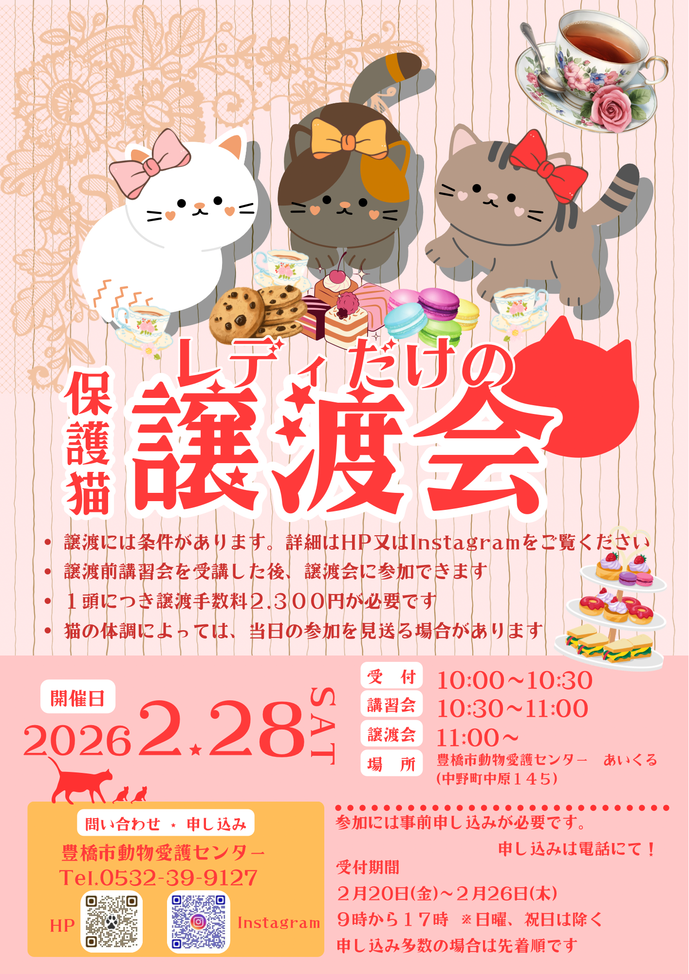 日時:令和7年11月22日(土曜日) 10時00分~10時30分 受付(身分証確認) 10時30分~11時00分 譲渡前講習会 譲渡希望調査届記入 受講証お渡し 11時00分~ 譲渡会 場所: […]