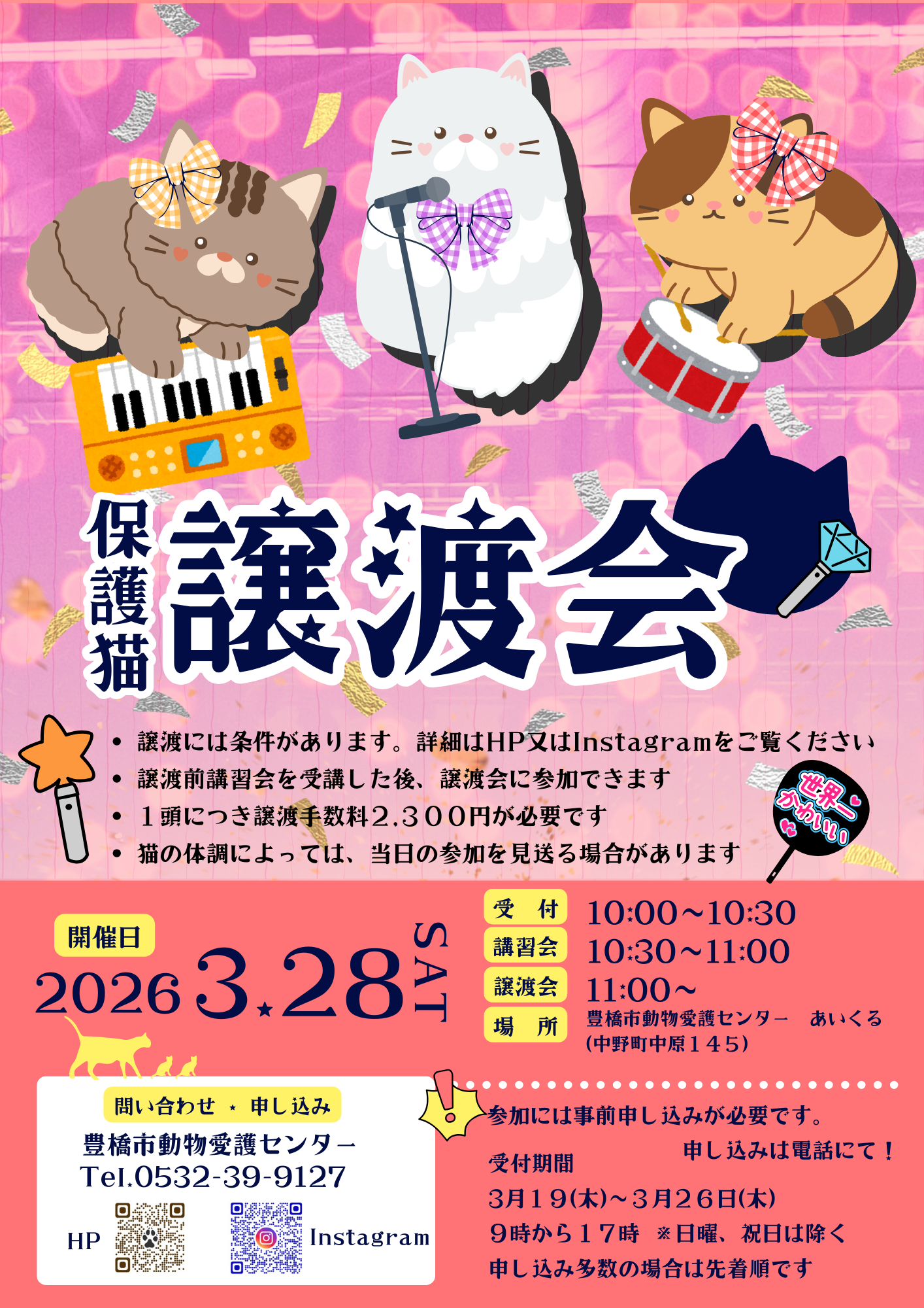 日時:令和7年11月8日(土曜日) 10時00分~10時30分 受付(身分証確認) 10時30分~11時00分 譲渡前講習会 譲渡希望調査届記入 受講証お渡し 11時00分~ 譲渡会 場所:豊 […]