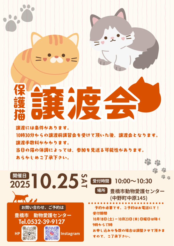 10月25日に、猫の譲渡前講習会及び譲渡会を行います。開催にあたり、参加希望の方は下記の要件を確認の上、電話で予約申し込みをしてください。