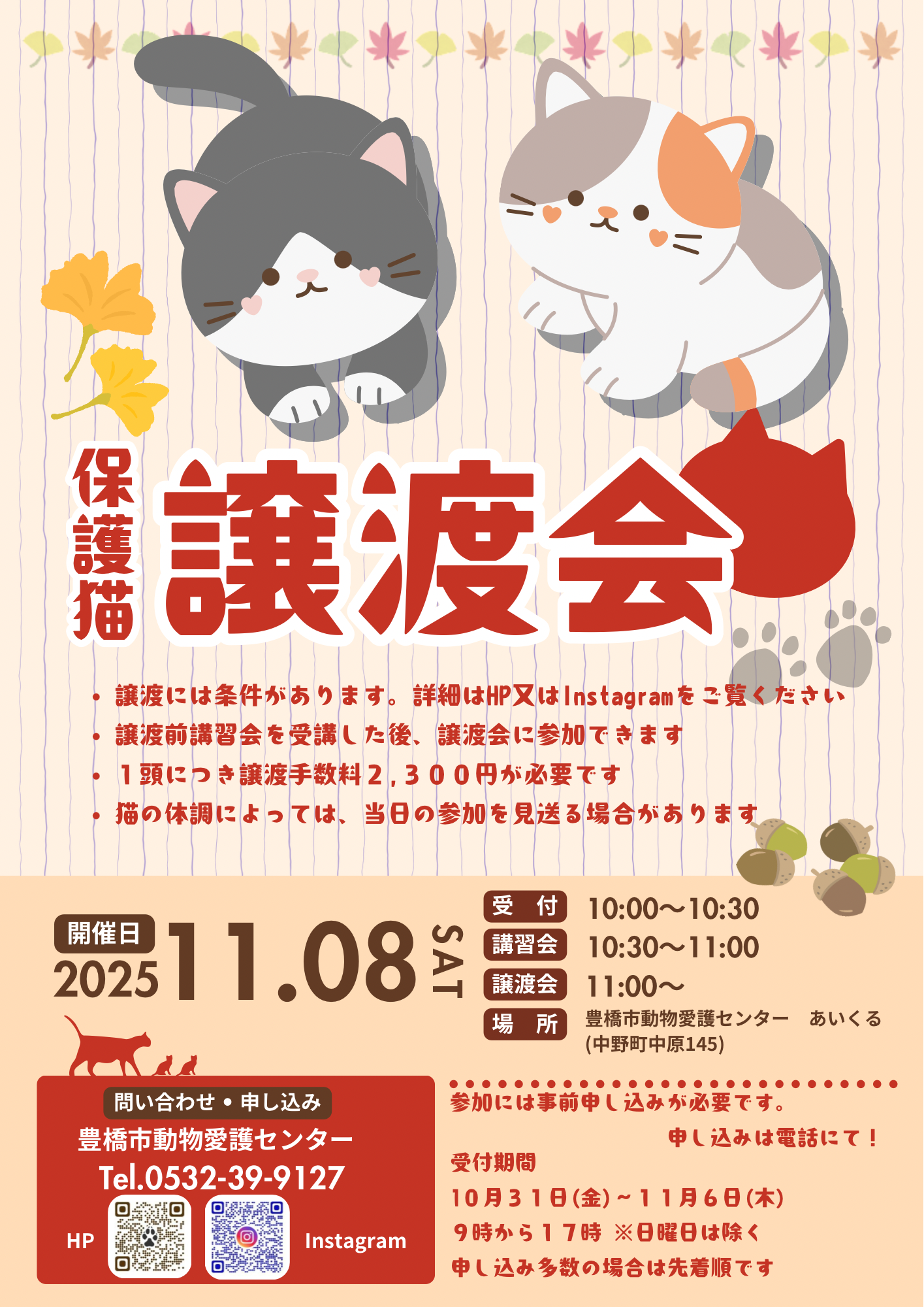 11月8日に、猫の譲渡前講習会及び譲渡会を行います。開催にあたり、参加希望の方は下記の要件を確認の上、電話で予約申し込みをしてください。