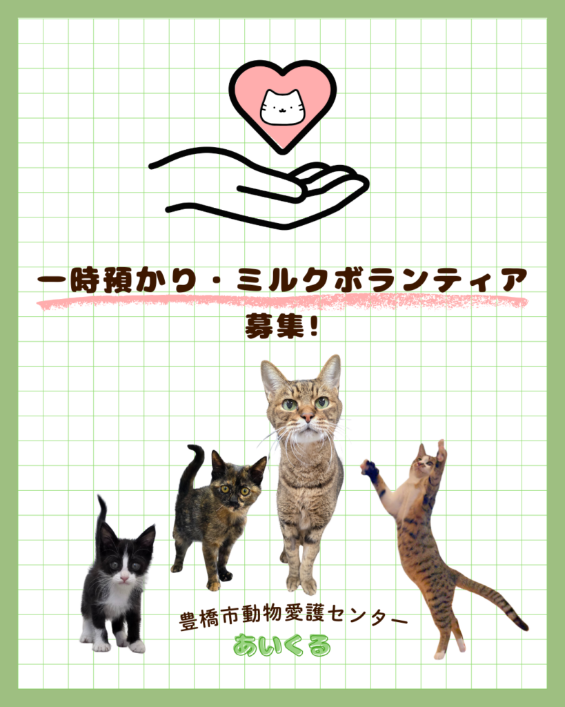 豊橋市動物愛護センター”あいくる”に保護された猫たちが新しい家族に出会えるよう、ご自宅で一定期間、保護猫の飼育をサポートしてくださるボランティアを募集します。